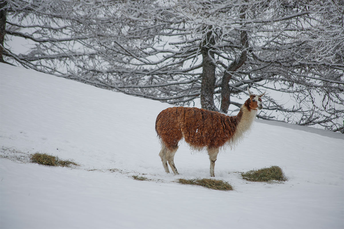 Auch unsere Lamas fühlen sich im Schnee wohl.