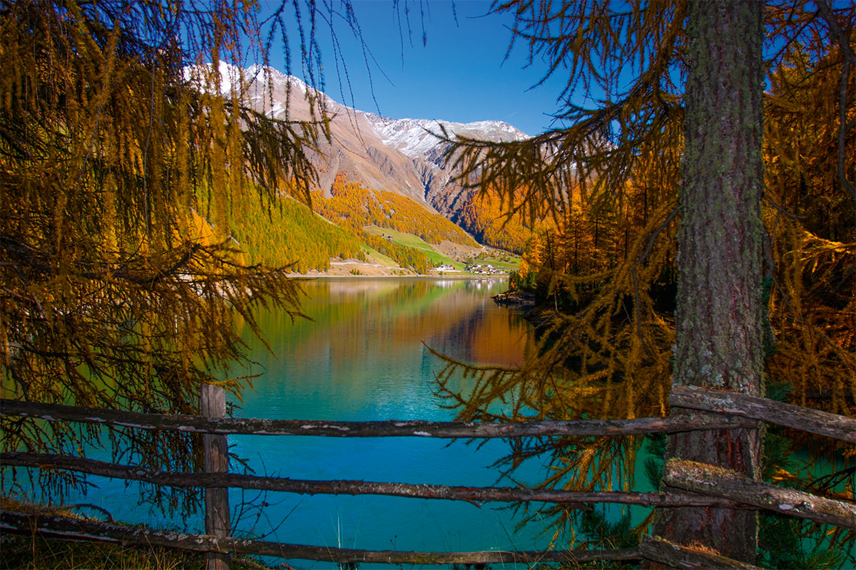 Der "Goldene Herbst" im Schnalstal Wandern mit herrlichster Fernsicht und goldige Farben. Machen Sie einen gemütlichen Seerundweg am farbenprächtigen Vernagtsee.